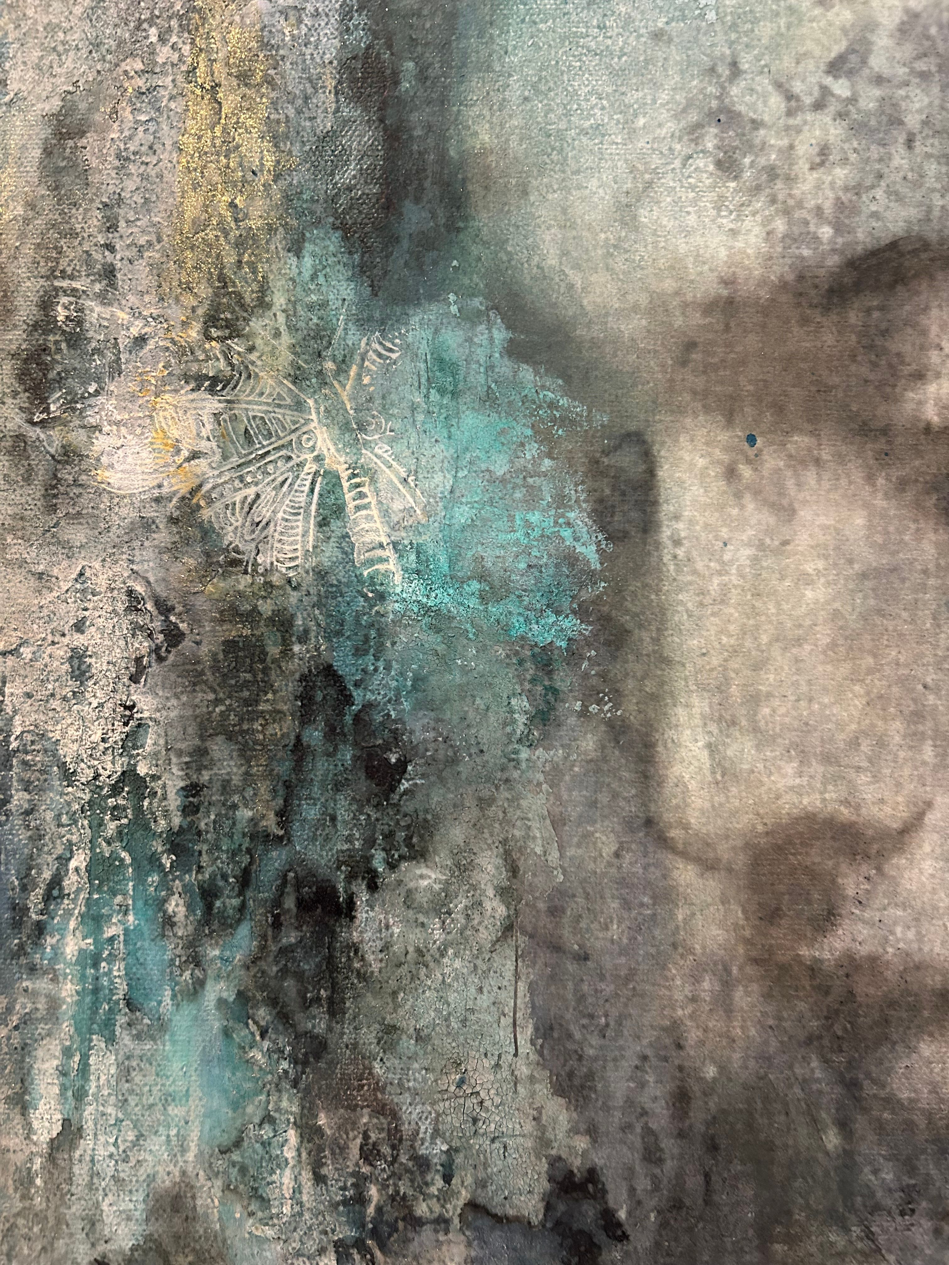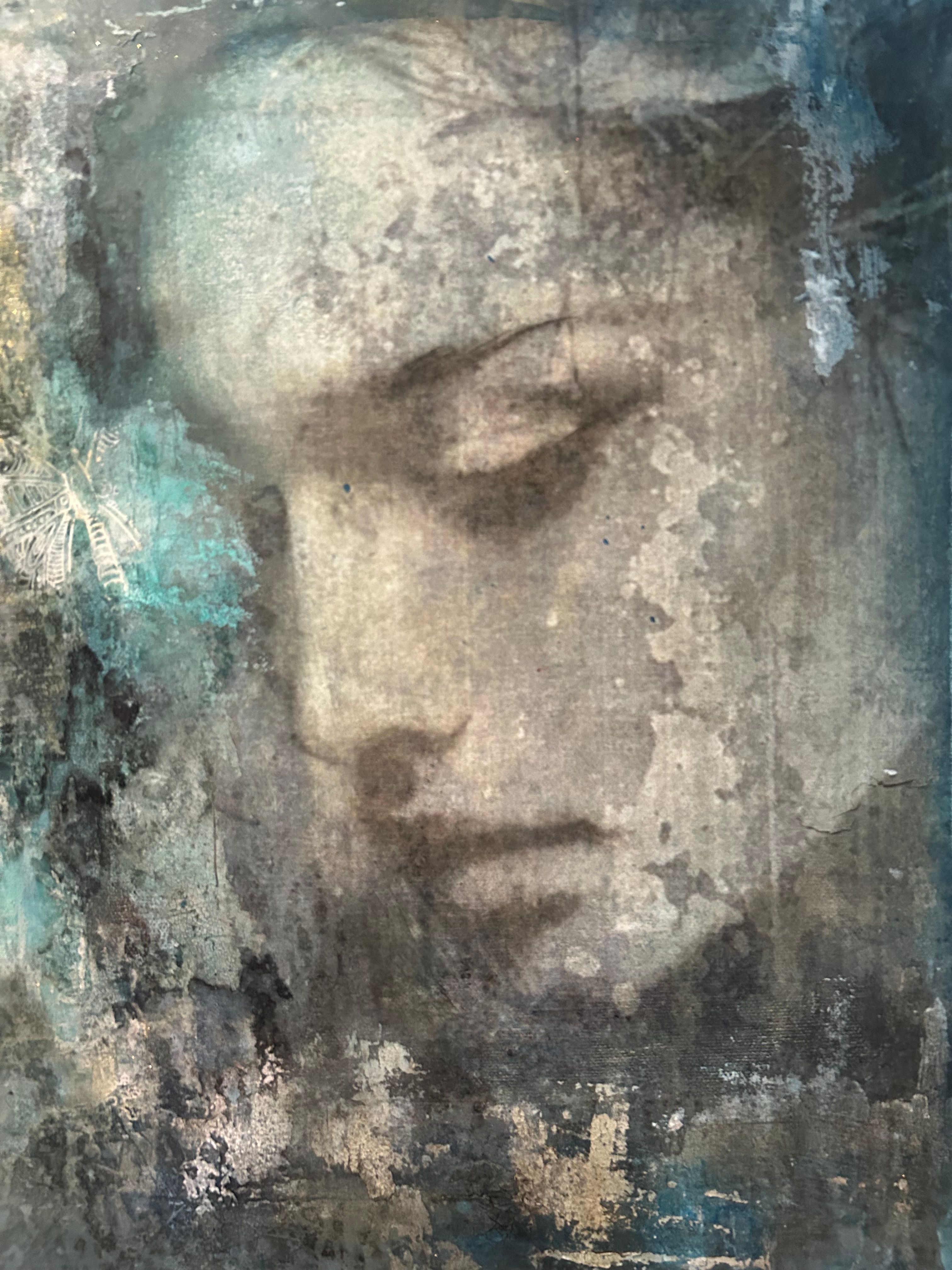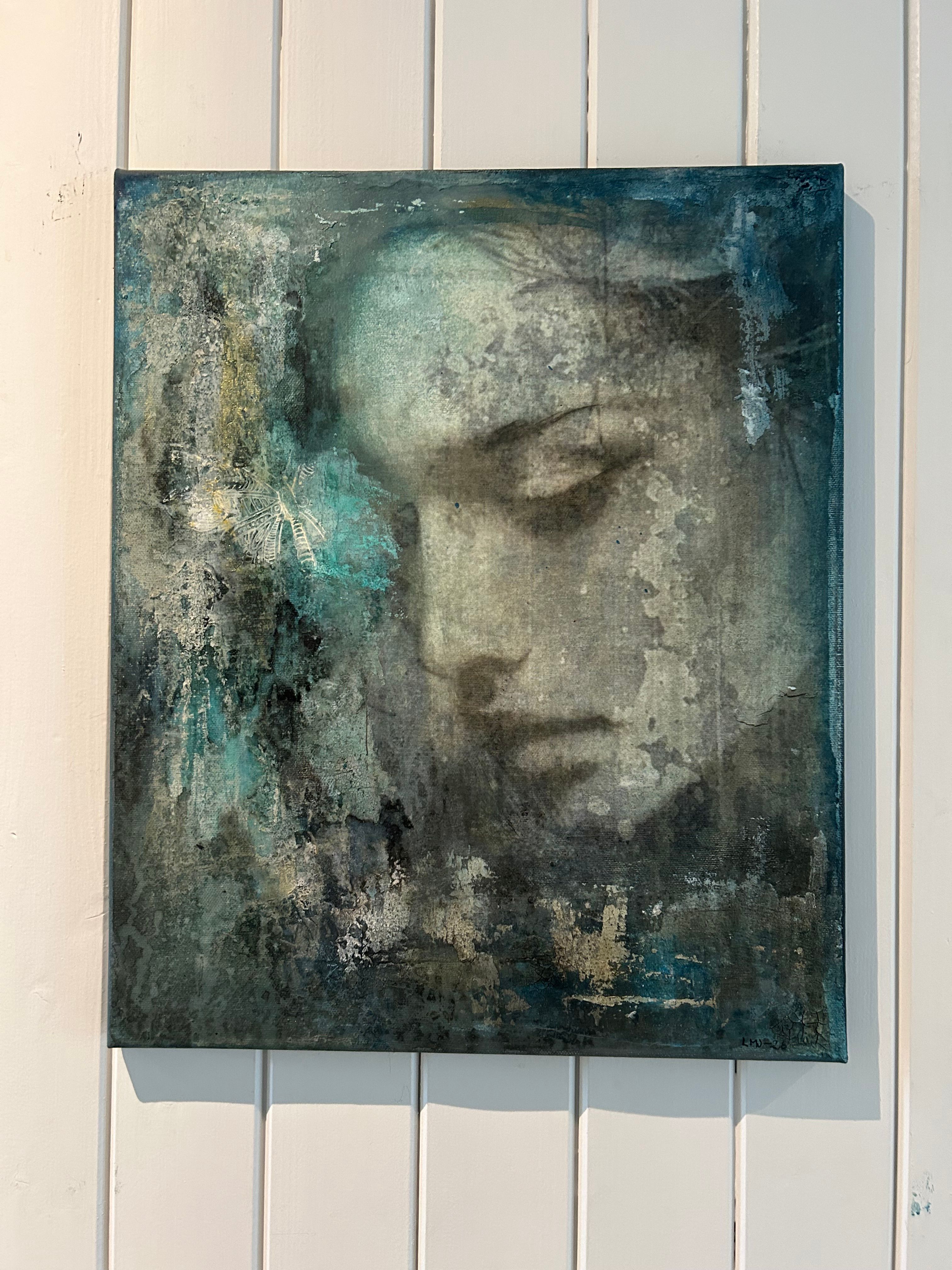 Maleri i dempede blå, grå og beige toner, med en teksturert og slitt overflate som gir et rustikt uttrykk. Bildet har et drømmende og melankolsk preg, der ansiktet delvis går i ett med bakgrunnen. Malt på lerret 46*38 cm.